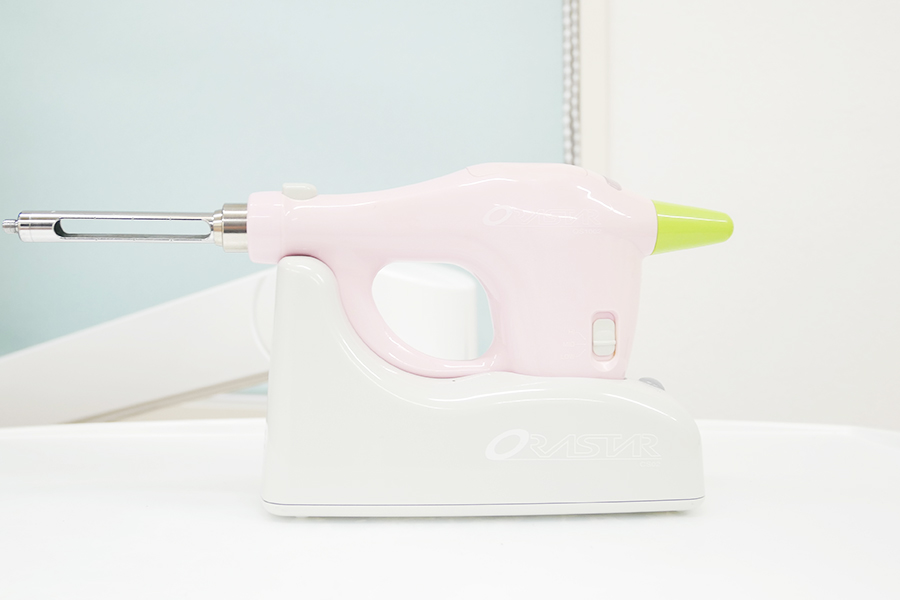 電動麻酔器を用いることで、麻酔液を一定の速度で注入でき、痛みを最小限に抑えています。